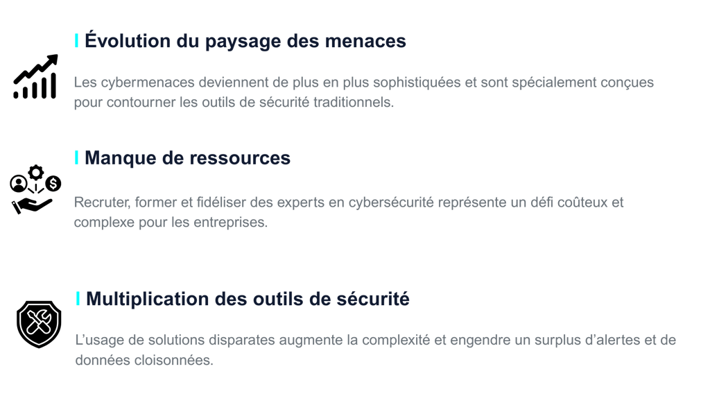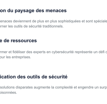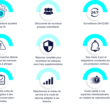 Alliant technologie de pointe et expertise humaine, cette approche associe des outils simples d’utilisation, optimisés par l’IA, à une surveillance continue 24 h/24 et 7 j/7 pour détecter, prévenir et répondre efficacement aux attaques.